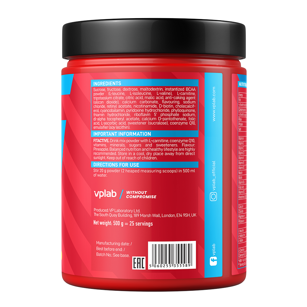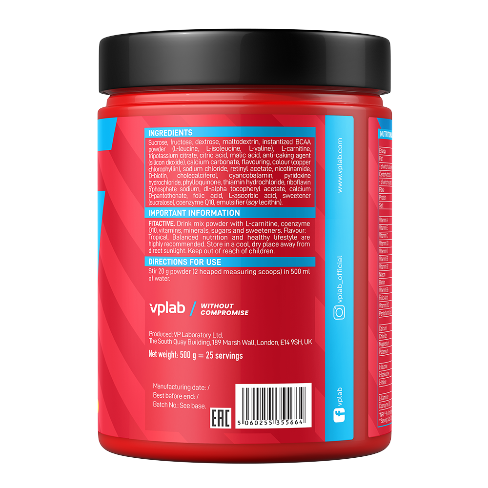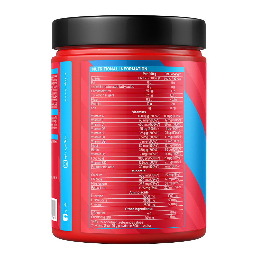 Ingredients: Sucrose, fructose, dextrose, maltodextrin, instantized BCAA powder (L-leucine, L-isoleucine, L-valine), L-carnitine, tripotassium citrate, citric acid, malic acid,anti-caking agent (silicon dioxide), calcium carbonate, flavouring, colour (beetroot red), sodium chloride, retinyl acetate, nicotinamide, D-biotin, cholecalciferol, cyancobalamin, pyridoxine hydrochloride, phylloquinone, thiamin hydrochloride, riboflavin 5’ phosphate sodium, dl-alpha tocopheryl acetate, calcium D-pantothenate, folic acid, L-ascorbic acid, sweetener (sucralose), coenzyme Q10, emulsifier (soy lecithin)